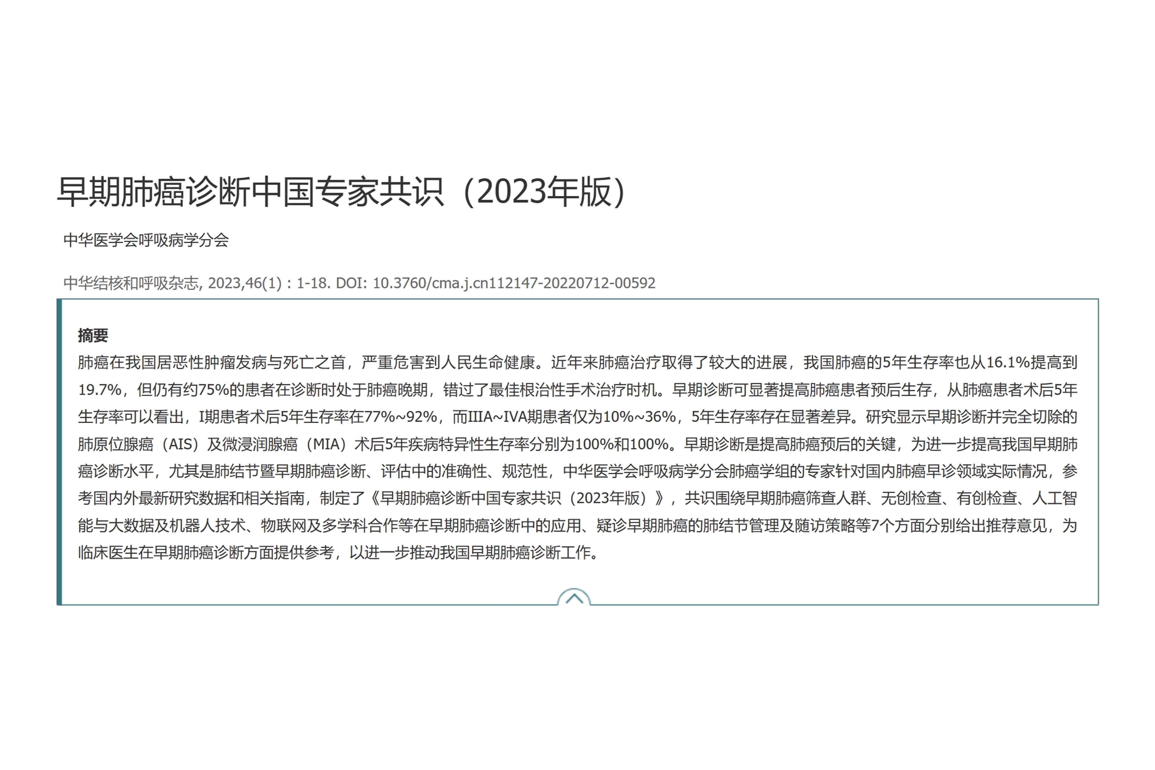 查看詳情早期診斷是提高肺癌預(yù)后的關(guān)鍵,為進(jìn)一步提高我國(guó)早期肺癌診斷水平,尤其是肺結(jié)節(jié)暨早期肺癌診斷、評(píng)估中的準(zhǔn)確性、規(guī)范性,中華醫(yī)學(xué)會(huì)呼吸病學(xué)分會(huì)肺癌學(xué)組的專(zhuān)家針對(duì)國(guó)內(nèi)肺癌早診領(lǐng)域?qū)嶋H情況,參考國(guó)內(nèi)外最新研究...