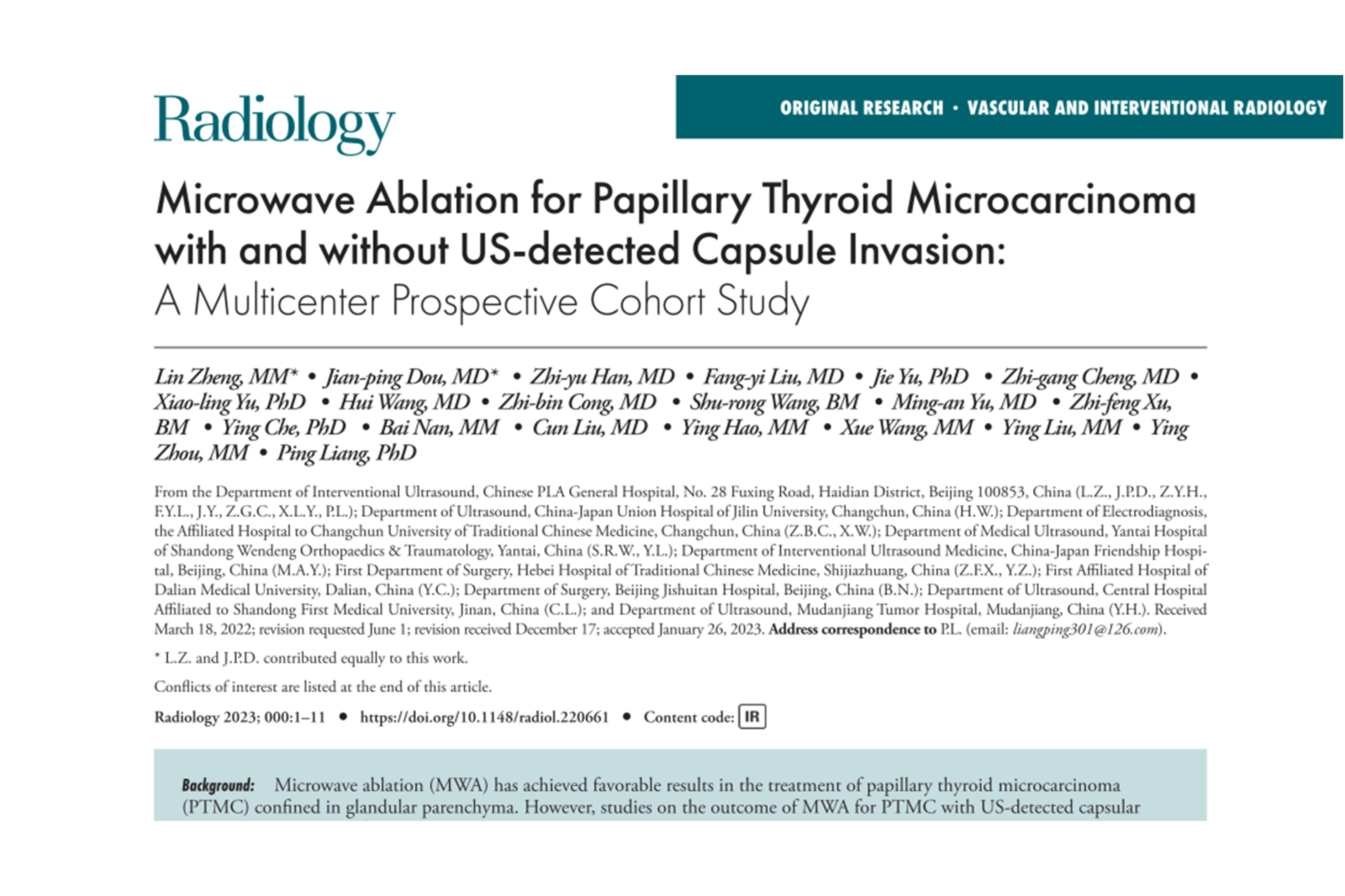 查看詳情梁萍教授牽頭多中心隊(duì)列研究│Radiology (IF:29.146): 經(jīng)皮微波消融治療術(shù)前超聲檢查有包膜侵犯的甲狀腺微小乳頭狀癌可取得與無(wú)包膜侵犯的甲狀腺微小乳頭狀癌相似的技術(shù)成功率及治療效果。甲狀腺微小乳頭狀癌(...