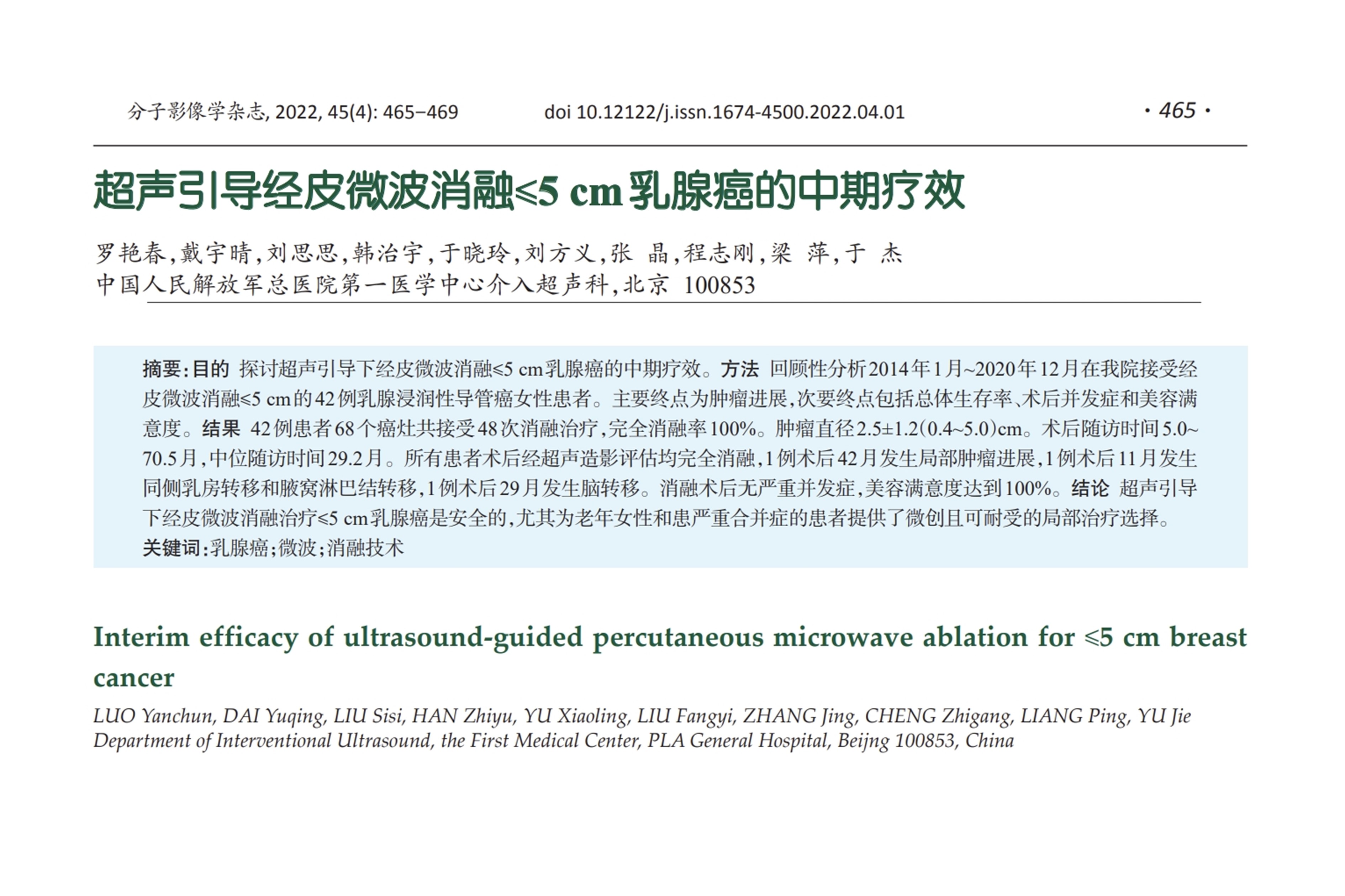 查看詳情超聲引導(dǎo)下經(jīng)皮微波消融治療 ≤5cm 乳腺癌是安全的,尤其為老年女性和患嚴(yán)重合并癥的患者提供了微創(chuàng)且可耐受的局部治療選擇。